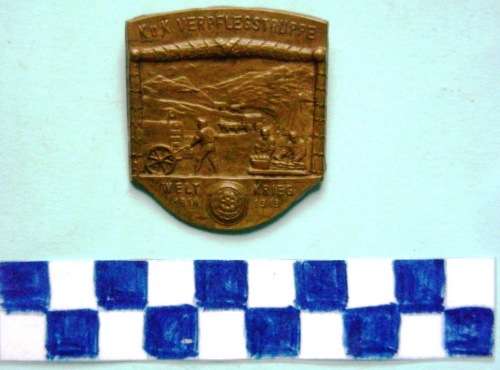 Di forma rettangolare con i lati superiore ed inferiore arrotondati. Al centro,in rilievo, da sinistra a destra il cofano ed una ruota anteriore di un autocarro con di fronte un meccanico, a destra due soldati dietro a due ceste di pane. In secondo piano una tenda, un paesaggio montano con un tornante di una strada discesa da due carri coperti trainati da due coppie di cavalli. Iscrizioni sui lati superiore ed inferiore. Sul verso, spilla di fissaggio.