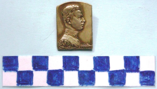A forma di rettangolo con lato superiore arrotondato. Al centro, in rilievo, il profilo a destra, di Carlo I in alta uniforme. Iscrizione lungo il lato inferiore, a destra. Sul verso, spilla di fissaggio.