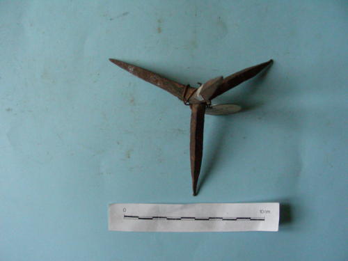 In due pezzi appuntiti alle estremità e piegati quasi ad angolo retto, saldati al centro.