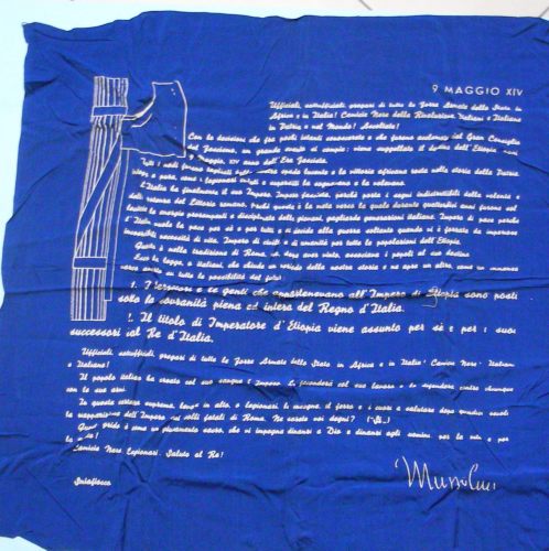 fazzoletto in tela blu stampato con scritte in bianco. In alto a sinistra l'angolo è ornato da un disegno di fascio littorio con scure verso destra.