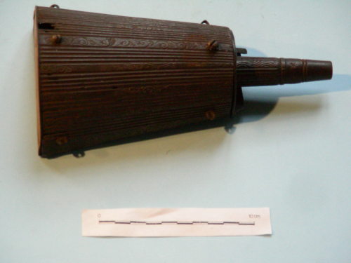 Di forma semi tronco-conica, con scanalature verticali alternate a fascette incise a volute barocche. Bocchello inciso e decorato. Quattro occhielli ai lati superiori ed inferiori, due viti di fissaggio.