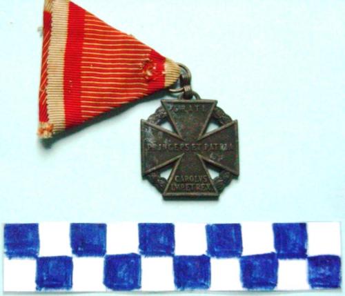 A forma di croce di San Giorgio su corona d'alloro con iscrizioni sui bracci, sul recto e sul verso. Nastrino ripiegato a formare un triangolo con strisce rosse su fondo bianco.