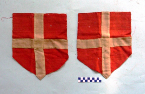 Scudo Savoia di rosso alla croce d'argento, di fattura artigianale con i bracci della croce cuciti allo scudo in modo non sempre parallelo e perpendicolare.
