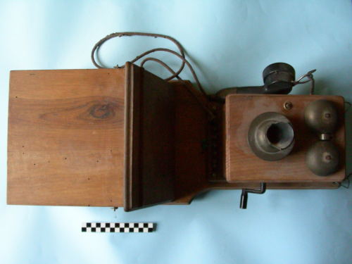Pannello posteriore sagomato, più largo alla base. Due contenitori indipendenti fissati al pannello; contenitore inferiore con chiusura a sportello basculante fissato con due ganci alle magliette laterali e lato superiore degradante. Contenitore superiore con apertura laterale e chiusura a vite. Esterno con due campanelle e microfono a base circolare e tromba sporgente. Manovella in posizione laterale; sei contatti elettrici a vite in posizione inferiore e attacco ad uncino e auricolare con impugnatura ed anello di fissaggio in posizione laterale, due ulteriori contatti in posizione superiore. Interno con meccanismo di funzionamento e collegamenti elettrici.
