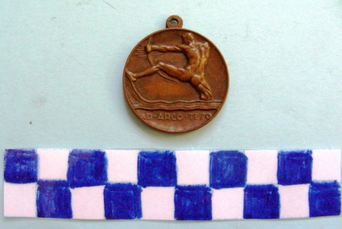 Disco di metallo, sul dritto in rilievo arcere nudo con arco teso rivolto a sinistra nell'atto di scagliare nove frecce, con piede sinistro che poggia sulla riva di un fiume stilizzato. Iscrizione sotto il corso del fiume. Sul verso in rilievo corona che riproduce una ruota cingolata che racchiude al centro tre cavalli rampanti sovapposti con sottostante iscrizione.