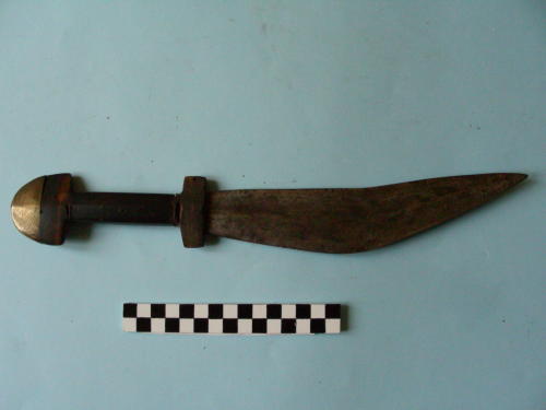 lama a doppio filo, ricurva al centro. Impugnatura con coccia a mezzaluna.