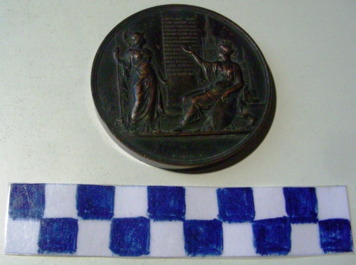 Di forma circolare. Sul recto, in rilievo, figura muliebre turrita con braccio sinistro poggiato ad uno scudo crociato, nell'atto di indicare una colonna a Minerva, in piedi con elmo e lancia. Ai suoi piedi una civetta. In secondo piano, il profilo del duomo di Milano. Iscrizione lungo la colonna e nell'esergo. Sul verso, iscrizione.