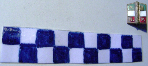 Di forma pentagonale. Sul recto i colori nazionali in orizzontale, al centro fascio littorio dorato a destra. Iscrizione dorata in campo verde e rosso. Sull verso, spilla di fissaggio ed iscrizione.