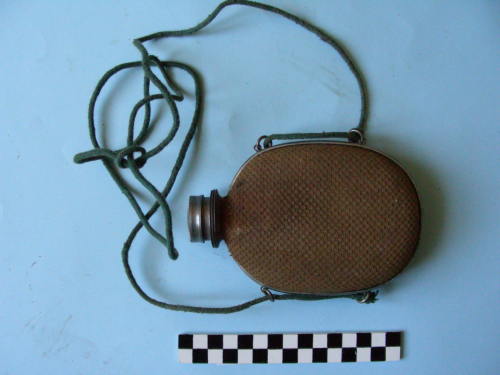 Corpo piatto, di forma ovale, rivestito, con profilatura metallica e quattro magliette per il cordino, presente e passante; tappo avvitabile.