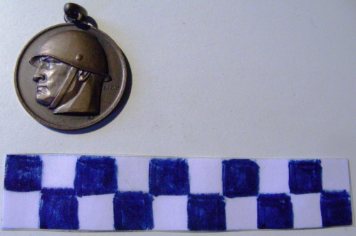 Di forma circolare. Sul recto, al centro, in rilievo, busto accollato a sinistra di Mussolini con elmo. Iscrizioni a destra e sotto la figura. Sul verso, iscrizione. Anello all'appiccagnolo.