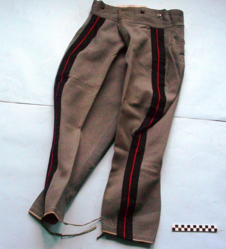 In cordellino grigio-verde alla cavallerizza con bande laterali di panno nero e filetto rosso scuro, due tasche ai fianchi ed una posteriore a destra chiusa da bottone, un taschino alla cintura a destra. Patta con chiusura a 5 bottoni e gancio. In cintura ulteriori 2 bottoni di diametro maggiore e 4 bottoni in metallo a pressione . Martingala per la regolazione del giro-vita cucita posteriormente. All'estremità dei pantaloni due fettucce di stoffa si stringono alla gamba per mantenere i pantaloni al'interno degli stivali.