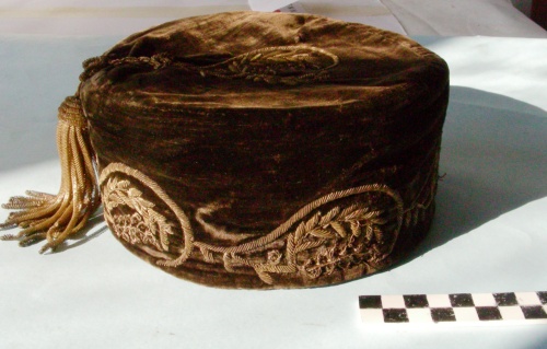 Di forma cilindrica in velluto nero. Decorazioni floreali in canottiglia dorata su tutta la circonferenza e sull'imperiale. Cordoncino dorato con lungo ficco in canottiglia cucito alla base della decorazione sull'imperiale a scendere su un lato.