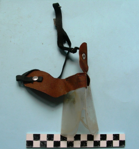 Lenti sagomate senza montatura con due bottoni automatici maschio alle estremità superiori da fissare agli automatici femmina inseriti nella montatura di tela marrone. All'interno striscia di panno fissata alla montatura tramite tre punti metallici. Due corde elastiche nere regolabili terminanti con gancio e anello.