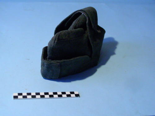 Floscia, con visiera ripiegata e cucita sulla fronte e paraorecchi fissati con due bottoni ai lati. Colore verde militare.