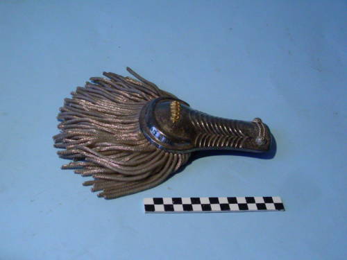 Di metallo argentato, di forma arrotondata, con due bottoni decorati ad incisione ed alamaro all'estremità inferiore, 11 scanalature sagomate nella parte centrale e bordo superiore con rilievo semiellittico che contiene un caduceo. Frange in canottiglia argentata applicate al bordo superiore. Sulla parte posteriore, vite di fissaggio, piastrina metallica ed imbottitura.