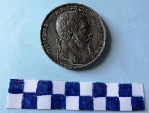 Di forma circolare. Sul recto al centro, in rilievo, busto laureato ed accollato a destra di Vittorio Emanuele II. Iscrizione lungo la corona e sotto la figura. Sul verso, al centro, in rilievo, iscrizione circondata da rami d'alloro e di quercia legati da nastro. Ulteriore iscrizione lungo la corona.