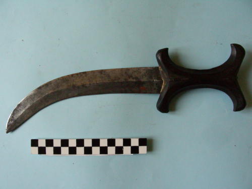 lama molto curva, a doppio filo, forgiata a mano, con costolatura centrale. Impugnatura di forma tipica a "X" che, assieme alla forma della lama, ne identifica la provenienza. Guardia integrata con l'mpugnatura. Lievi linee decorative sulla parte centrale dell'impugnatura.