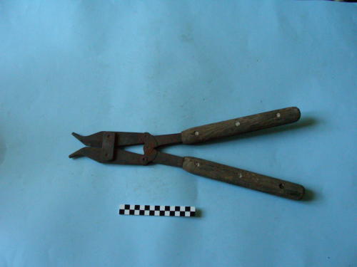 Due impugnature con manico ligneo fissate con sei viti, e meccanismo di raccordo a tre bulloni; due lame fissate da cerniera a due bulloni, con apice a calice.