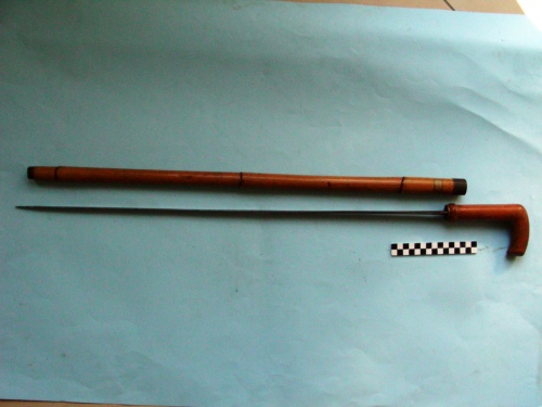 Impugnatura ricurva a manico d'ombrello, Anima con lama a sezione quadrangolare, priva di filo, con punta al centro; decorazioni floreali ad acido al tallone per il primo terzo della lama. Decorazioni geometriche su anello al manico. Anello alla cappa.