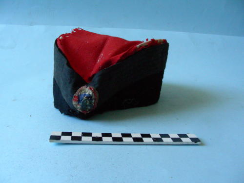 Di forma circolare, con fascia bordata alta sulle tempie. Sommità di colore rosso. Rivestimento interno di colore bianco. Fregio frontale con colori rosso, bianco e blu.