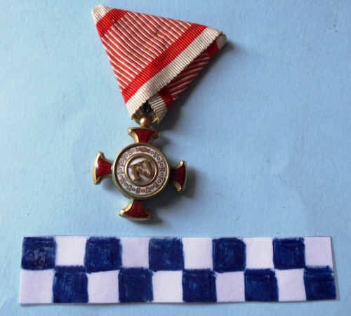 Croce patente con i bracci di colore rosso con al centro un medaglione. Sul recto monogramma dorato circondato da cornice circolare riportante il motto della casa d'Asburgo, le cui lettere sono alternate da circoletti. Sul verso, nel disco centrale è riportata la data dell'inizio del regno dell'imperatore. Nastrino ripiegato a formare un triangolo con strisce rosse e bianche di diversa larghezza.