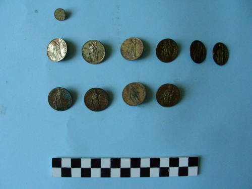 serie di undici bottoni metallici con occhiello sul retro e superficie superiore ornata da bordino leggermente dentellato, di cui dieci di uguale grandezza ma con due varianti di iscrizione, e uno di formato più piccolo. Sui bottoni grandi è raffigurata la personificazione della Libertà (donna stante di fronte e volta a sinistra, che sostiene con la sinistra una picca sormontata da berretto frigio e poggia la destra su fascio littorio). Sul bottone piccolo si trova invece un'iscrizione al centro, sormontata da stella a otto punte; nella parte inferiore c'è una rosetta affiancata da due fiori più piccoli.