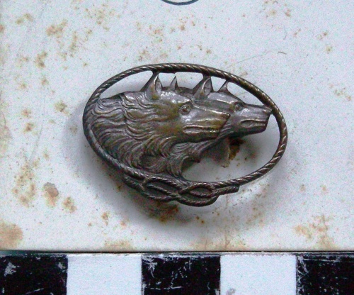 A forma di nastro che forma un'ellisse chiuso da un nodo Savoia con all'interno due musi di lupo di profilo.