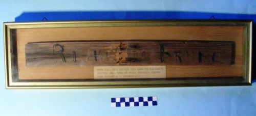 Braccio orizzontale di una croce recante il nome del defunto. L'oggetto è conservato in una teca di legno e metallo con vetro sul lato superiore.