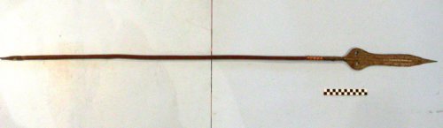 lama a daga, piatta, sottile, con nervatura centrale e due fori di alleggerimento nella parte più larga. Lamina di rame avvolta sullasta, vicino al codolo. Asta originale con incisioni a spirale per tutta la lunghezza. Puntale in ferro, con punta a scalpello.