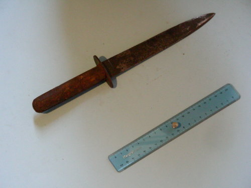 Lama dritta, ad un filo e controfilo alla punta, simmetrica al centro. Guardia a croce, dritta. Impugnatura a due guancette, fissate con spinotti.