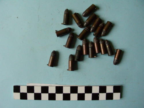 Bossolo di forma cilindrica con spillo alla base; proiettile conico con punta arrotondata e zigrinata.