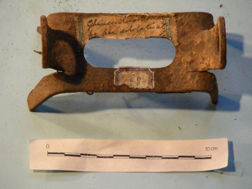 A quattro piedi, di cui due ritorti, e due asole superiori; feritoia centrale e listella inferiore fissata con due rivetti.