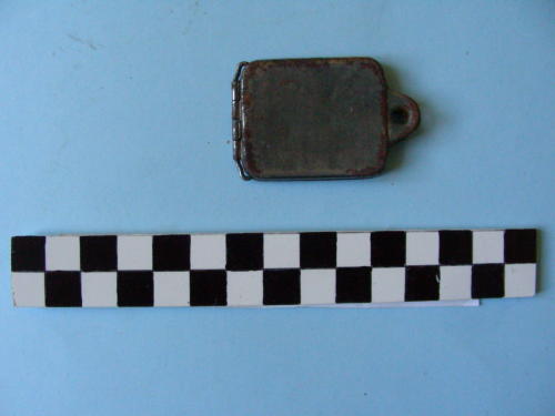 Di forma rettangolare, a due valve apribili, con doppia asola per catenella di trasporto. Contiene foglio ripiegato.