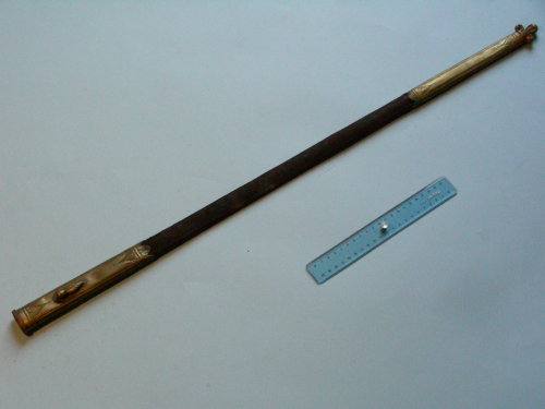 Cappa incisa con bocchetta allargata, bottone fermatasca a forma di foglia; puntale inciso a forma di giglio.