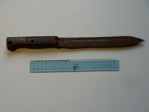 Lama dritta, con sguscio fino al controfilo su entrambi i lati. Impugnatura con guancette zigrinate trattenute da spinotto passante.