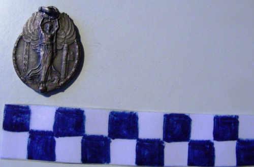 Di forma ovale. Sul recto, al centro, in rilievo figura allegorica femminile della Vittoria in piedi, ad ali spiegate che regge sulla testa, una corona d'alloro che forma l'appiccagnolo. A sinistra, iscrizione in verticale, a destra, fascio littorio. Sul verso, in rilievo in alto, stella a cinque punte raggiante con decorazioni floreali nella parte superiore. Anello all'appiccagnolo.