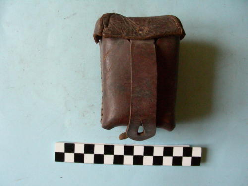 Contenitore singolo, con passante cucito sul retro; cinghia di chiusura anteriore con foro da infilare nel bottone di cuoio in posizione inferiore.