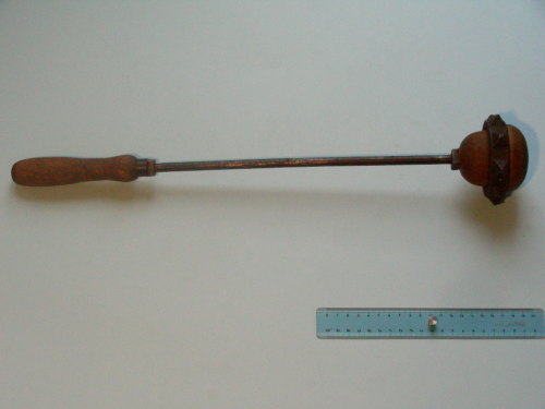 asta a sezione tonda con impugnatura tornita "a manico di lima". Testa ad anello in legno tornito di forma ovoidale a due sezioni. Sulla parte alta della sezione minore è inserito un anello con nove puntoni a sezione quadrata fissato con viti a legno