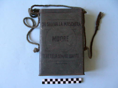 A parallelepipedo, con tre magliette su entrambi i lati e tracolla a cordino in funzione anche di fermo del coperchio. Coperchio a pressione. Verniciatura di colore grigio-verde scuro.