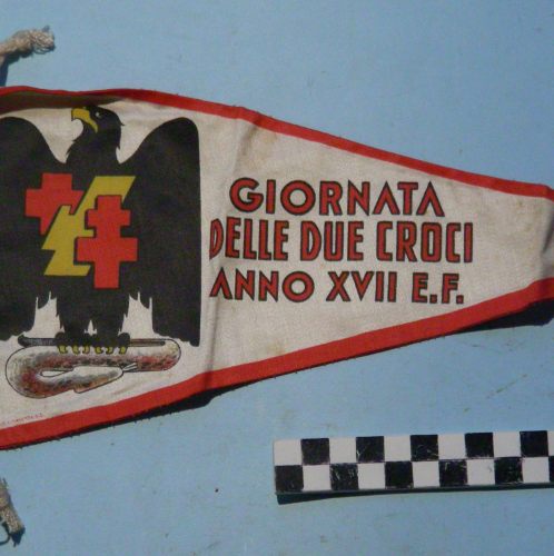 A forma di triangolo isoscele di tela colorata a serigrafia. Bordo rosso su sfondo bianco, conserva doppio cordino di fissaggio inserito ai lati della base. Un fascio littorio stilizzato di colore giallo separa una croce greca da una croce di Lorena entrambe rosse, il tutto è inserito al centro di un'aquila nera che ghermisce un serpente. di fianco una scritta su tre righe di colore rosso bordato in nero.