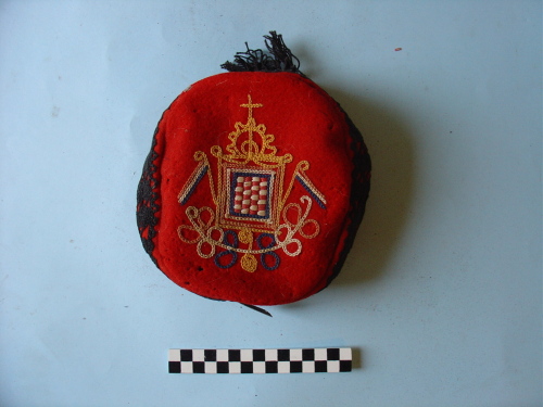 Calotta di forma circolare di colore rosso con decorazione cucita sulla sommità. Bordo decorato a motivi geometrici neri.