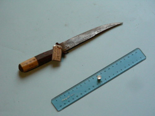 Lama incisa a motivi geometrici, leggermente curva, a un filo, punta al dorso e controfilo. Guardia stretta, a due riccioli contrapposti. Impugnatura a sezione ottagonale, zigrinata, con inserto decorato e cordelline alla base della guardia; cappetta bombata con bottone metallico e codolo ribattuto.