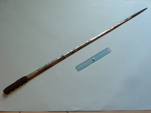 Dritta, nichelata e con incisioni ad acido a motivi militari e floreali fino a metà; piccolo sguscio centrale su entrambi i lati fino a metà; punta dritta, simmetrica al centro. Conserva l'impugnatura liscia e anatomica e la cappetta arrotondata e zigrinata nella parte superiore.