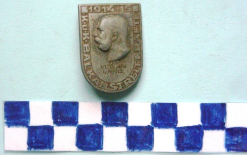 A forma di scudo. Al centro, in rilievo, profilo rivolto a sinistra di Francesco Giuseppe, circondato da iscrizoni. Sul verso spilla di fissaggio ed ulteriore iscrizione.