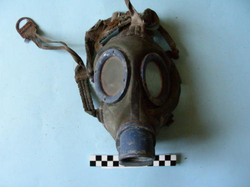 Facciale con due lenti circolari contornate da lamierina metallica e cinghie di fissaggio alla nuca cucite al bordo; cinturino frontale con asola. Protuberanza in posizione anteriore, con alloggiamento filettato per il filtro contenente un disco spugnoso fissato al centro, e grata a fori circolari per la valvola di scarico.