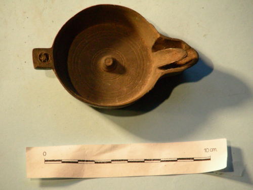 Piatto circolare con bordo rialzato, beccuccio e portastoppino. Fondo del piatto inciso a cerchi concentrici.