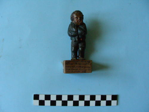 effige di uno spazzacamino che porta un sacco sulle spalle, incollata postuma sopra una base di legno.