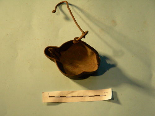 Piatto a quadrifoglio con bordo rialzato e portastoppino. Gancio di sostegno con punta ad uncino collegato mediante snodo al braccio ricurvo del piatto.