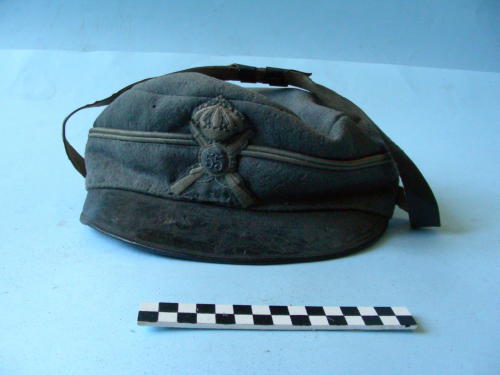 Di forma circolare con visiera prominente e sottogola a cinturino regolabile fissato alle tempie con due bottoni e posizionato sopra la visiera; fregio con stemma della fanteria in posizione frontale sovrapposto a banda di colore grigio. Interno foderato di colore verde. Bordo superiore interno decorato con greca dorata.