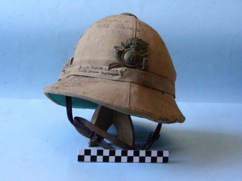 Calotta a sei sezioni sormontata da calottino in lamiera con tre fori di aerazione; tesa larga; un foro di aerazione laterale e taschino sul lato destro. Fascia posta sopra la tesa, fissato attraverso passanti. Fregio in posizione frontale. Color kaki e fodera interna di colore verde.